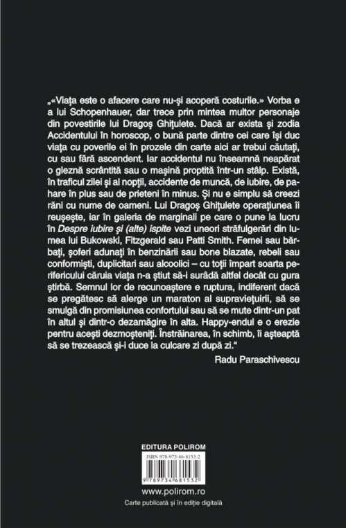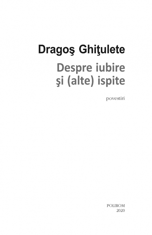 „«Viața este o afacere care nu-și acoperă costurile.» Vorba e a lui Schopenhauer, dar trece prin mintea multor personaje din povestirile lui Dragoș Ghițulete. Dacă ar exista și zodia Accidentului în horoscop, o bună parte dintre cei care își duc viața cu poverile ei în prozele din carte aici ar trebui căutați, cu sau fără ascendent. Iar accidentul nu înseamnă neapărat o gleznă scrîntită sau o mașină proptită într-un stîlp. Există, în traficul zilei și al nopții, accidente de muncă, de iubire, de pahare în plus sau de prieteni în minus. Și nu e simplu să creezi răni cu nume de oameni. Lui Dragoș Ghițulete operațiunea îi reușește, iar în galeria de marginali pe care o pune la lucru în Despre iubire și (alte) ispite vezi uneori străfulgerări din lumea lui Bukowski, Fitzgerald sau Patti Smith. Femei sau bărbați, șoferi adunați în benzinării sau bone blazate, rebeli sau conformiști, duplicitari sau alcoolici – cu toții împart soarta perifericului căruia viața n-a știut să-i surîdă altfel decît cu gura știrbă. Semnul lor de recunoaștere e ruptura, indiferent dacă se pregătesc să alerge un maraton al supraviețuirii, să se smulgă din promisiunea confortului sau să se mute dintr-un pat în altul și dintr-o dezamăgire în alta. Happy-endul e o erezie pentru acești dezmoșteniți. Înstrăinarea, în schimb, îi așteaptă să se trezească și-i duce la culcare zi după zi.” (Radu Paraschivescu)