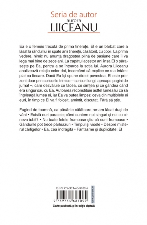 Ea e o femeie trecută de prima tinereţe. El e un bărbat care a lăsat la rîndul lui în spate anii tinereţii, căsătorit, cu copii. La prima vedere, nimic nu anunţă dragostea plină de pasiune care îi va lega mai bine de zece ani. La capătul acestor ani însă El o părăseşte pe Ea, pentru a se întoarce la soţia lui. Aurora Liiceanu analizează relaţia celor doi, încercînd să explice ce s-a întîmplat cu fiecare. Dacă Ea îşi spune direct povestea, El este prezent doar prin scrisorile trimise – scrisori lungi, aproape pagini de jurnal –, care dezvăluie ce făcea, ce simţea şi ce gîndea cînd era singur sau cu Ea. Autoarea reconstituie astfel lumea lui ca să înţeleagă lumea ei, iar Ea va putea limpezi ceva din multiplele ei euri, în timp ce El va fi folosit, amintit, discutat. Fără să ştie.