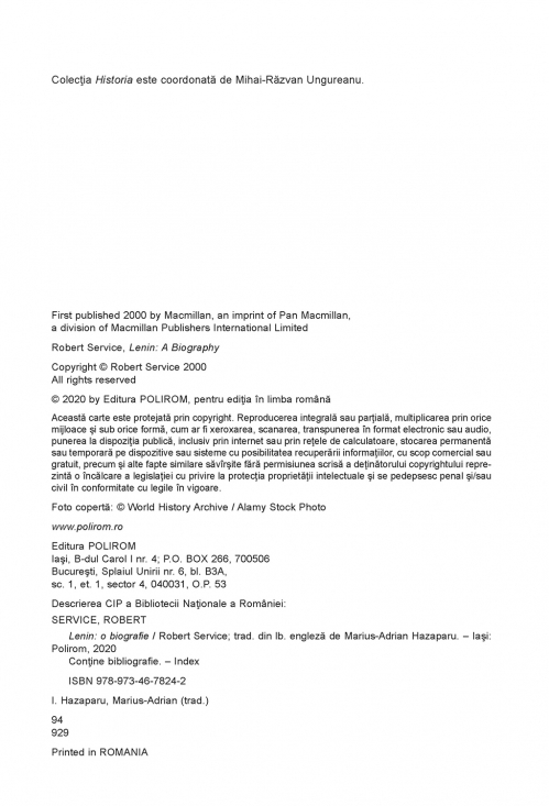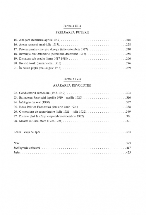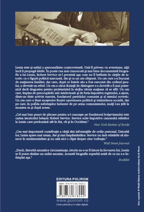 Lenin este și astăzi o personalitate controversată. Unii îl privesc cu aversiune, alții încă îi propagă ideile. În poate cea mai cunoscută și mai bine documentată biografie a lui Lenin, Robert Service ni-l prezintă așa cum nu îl întîlnim în cărțile de istorie: ca o figură politică marcantă, dar și ca un om obișnuit. Un om care s-a bucurat de susținerea familiei, dar care, după ce fratele său a fost executat din ordinul țarului, a devenit un rebel. Un om a cărui dorință de distrugere s-a dovedit a fi mai puternică decît dragostea pentru proletariatul în slujba căruia susținea că se află. Un om care, împins de preocupările sale intelectuale și de furia împotriva regimului, a ajuns, dintr-un tînăr activist marxist, fondatorul partidului comunist și al statului sovietic. Un om care a lăsat moștenire Rusiei opresiunea politică și intimidarea socială, dar pe care, în pofida suferințelor îndurate de pe urma comunismului, mulți l-au jelit la moartea sa și după aceea.