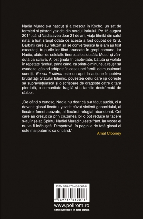 Nadia Murad s-a născut și a crescut în Kocho, un sat de fermieri și păstori yazidiți din nordul Irakului. Pe 15 august 2014, cînd Nadia avea doar 21 de ani, viața tihnită din satul natal a luat sfîrșit odată ce acesta a fost ocupat de ISIS. Bărbații care au refuzat să se convertească la islam au fost executați, trupurile lor fiind aruncate în gropi comune, iar Nadia, alături de celelalte tinere, a fost dusă la Mosul și vîndută ca sclavă. A fost ținută în captivitate, bătută și violată în repetate rînduri, pînă cînd, ca printr-o minune, a reușit să evadeze, găsind adăpost în casa unei familii de musulmani sunniți. Eu voi fi ultima este un apel la acțiune împotriva brutalității Statului Islamic, povestea celui care își dorește să supraviețuiască și o scrisoare de dragoste către o țară pierdută, o comunitate fragilă și o familie destrămată de război.