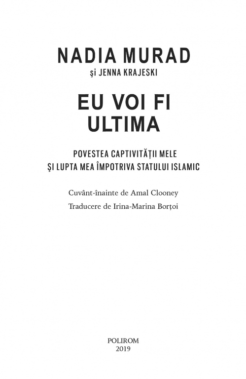 Comandă online Eu voi fi ultima. Povestea captivităţii mele şi lupta mea împotriva Statului Islamic (ediția 2019) la 42,20 lei isbn 9789734680078 scrisă de Nadia Murad , Jenna Krajeski , Amal Clooney, tiparită la editura Polirom face parte din colecția -. Cartea poate fi livrată în circa 5 zile cu plata ramburs sau online cu cardul.