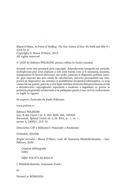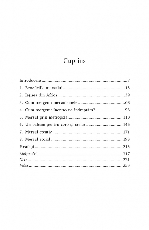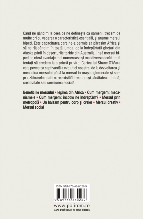 Cînd ne gîndim la ceea ce ne defineşte ca oameni, trecem de multe ori cu vederea o caracteristică esenţială, şi anume mersul biped. Este capacitatea care ne-a permis să părăsim Africa şi să ne răspîndim în toată lumea, de la îndepărtaţii gheţari din Alaska pînă în deşerturile toride din Australia. Însă mersul biped ne oferă avantaje mai numeroase şi mai diverse decît am fi tentaţi să credem la o primă privire. Cartea lui Shane O’Mara este povestea captivantă a evoluţiei noastre, de la dezvoltarea şi mecanica mersului pînă la mersul în oraşe aglomerate şi surprinzătoarele relaţii care există între mers şi sănătatea mintală, creativitate sau coeziunea socială.