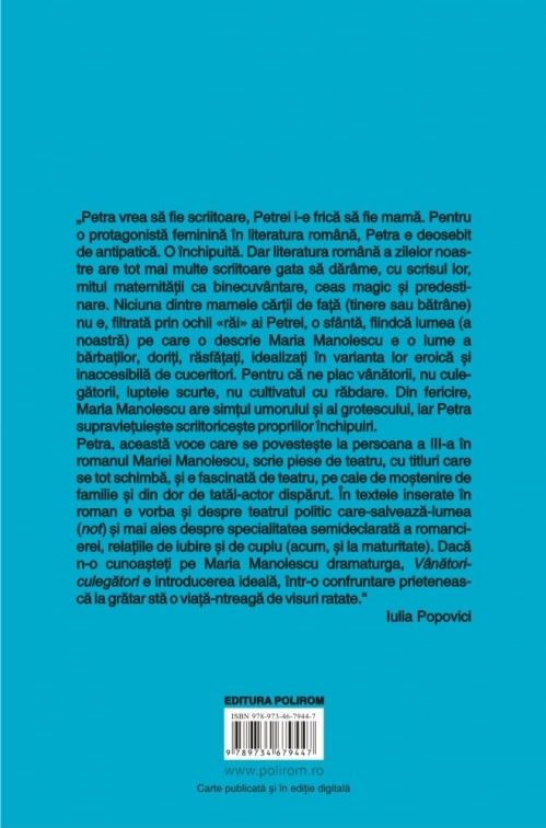 „Petra vrea să fie scriitoare, Petrei i-e frică să fie mamă. Pentru o protagonistă feminină în literatura română, Petra e deosebit de antipatică. O închipuită. Dar literatura română a zilelor noastre are tot mai multe scriitoare gata să dărîme, cu scrisul lor, mitul maternității ca binecuvîntare, ceas magic și predestinare. Niciuna dintre mamele cărții de față (tinere sau bătrîne) nu e, filtrată prin ochii «răi» ai Petrei, o sfîntă, fiindcă lumea (a noastră) pe care o descrie Maria Manolescu e o lume a bărbaților, doriți, răsfățați, idealizați în varianta lor eroică și inaccesibilă de cuceritori. Pentru că ne plac vînătorii, nu culegătorii, luptele scurte, nu cultivatul cu răbdare. Din fericire, Maria Manolescu are simțul umorului și al grotescului, iar Petra supraviețuiește scriitoricește propriilor închipuiri. Petra, această voce care se povestește la persoana a III-a în romanul Mariei Manolescu, scrie piese de teatru, cu titluri care se tot schimbă, și e fascinată de teatru, pe cale de moștenire de familie și din dor de tatăl-actor dispărut. În textele inserate în roman e vorba și despre teatrul politic care-salvează-lumea (not) și mai ales despre specialitatea semideclarată a romancierei, relațiile de iubire și de cuplu (acum, și la maturitate). Dacă n-o cunoașteți pe Maria Manolescu dramaturga, Vînători-culegători e introducerea ideală, într-o confruntare prietenească la grătar stă o viață-ntreagă de visuri ratate.” (Iulia Popovici)