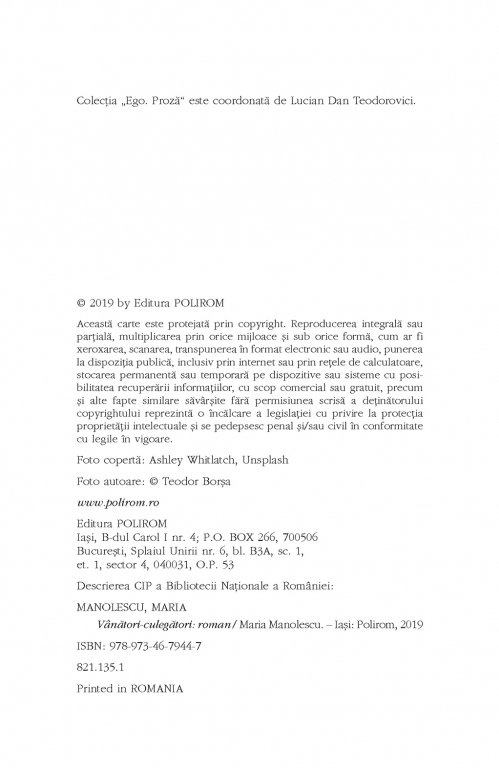 Maria Manolescu citește fragmente din romanul său, Vânători-culegătoriComandă online Vânători-culegători la 10,60 lei isbn 9789734679447 scrisă de Maria Manolescu, tiparită la editura Polirom face parte din colecția Ego. Proza. Cartea poate fi livrată în circa 2 zile cu plata ramburs sau online cu cardul.