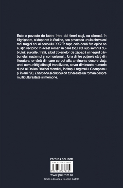 Este o poveste de iubire între doi tineri sași, ea rămasă în Sighișoara, el deportat la Stalino, sau povestea unuia dintre cei mai tragici ani ai secolului XX? În fapt, cele două fire epice se susțin reciproc în acest roman în care totul stă sub semnul dublului: surorile, frații, albul troienelor de zăpadă și negrul cărbunelui, nazismul și comunismul... Una dintre puținele cărți din literatura română din care se pot afla amănunte despre viața unei comunități săsești transilvane, sever diminuate numeric după al Doilea Război Mondial, în timpul regimului Ceaușescu și în anii ’90, Dincoace și dincolo de tunel este un roman despre multiculturalitate și memorie.
