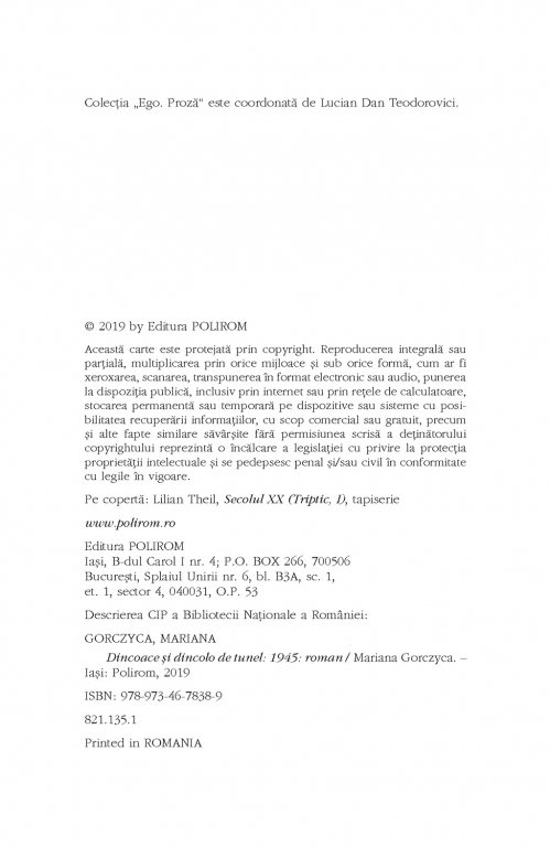 Comandă online cartea "Dincoace și dincolo de tunel. 1945" la 10,60 lei isbn 9789734678389 scrisă de Mariana Gorczyca, tiparită la editura Polirom face parte din colecția Ego. Proza. Cartea poate fi livrată în circa 2 zile cu plata ramburs sau online cu cardul.