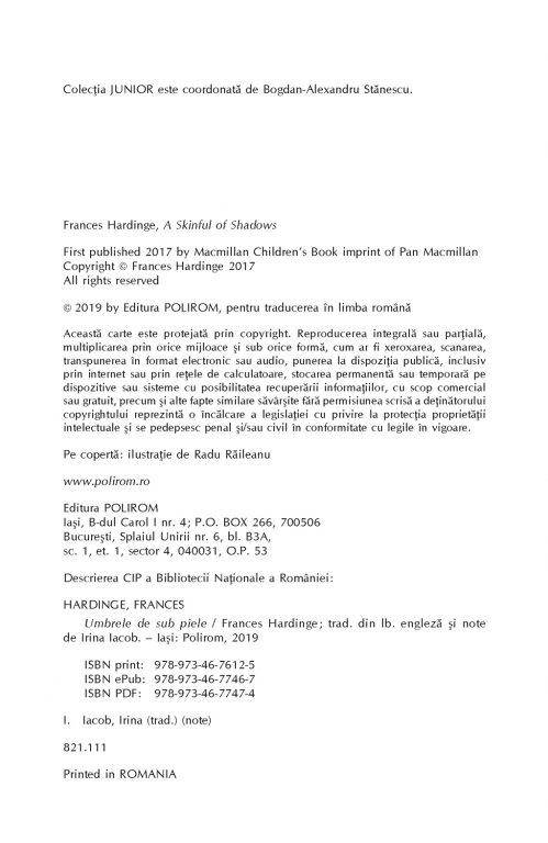 Comandă online cartea "Umbrele de sub piele" la 17,49 lei isbn 9789734676125 scrisă de Frances Hardinge, tiparită la editura Polirom face parte din colecția JUNIOR. cu plata ramburs sau online cu cardul. Momentan titlul "Umbrele de sub piele" nu este disponibil însa vă puteți înscrie pentru a fi notificat în momenul reaprovizionarii.