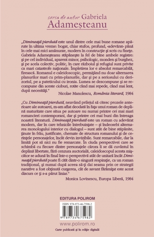 Dimineață pierdută este unul dintre cele mai bune romane apărute în ultima vreme: bogat, chiar stufos, profund, «adevărat» pînă în cele mai mici amănunte, modern în construcție și scris cu finețe. Gabriela Adameșteanu stăpînește la fel de bine ambele registre: și pe cel individual, aparent minor, psihologic, monden și burghez, și pe acela colectiv, politic, în care războiul și refugiul sînt privite ca mari catastrofe naționale. Împletirea lor e absolut remarcabilă, firească. Romanul e caleidoscopic, permițînd nu doar alternarea planurilor mari cu prim-planurile, dar și pe a seriosului cu derizoriul, pe a pateticului cu ironia. Lumea se descompune și se recompune din aceste cioburi, rotite cînd mai repede, cînd mai lent, după necesități.” (Nicolae Manolescu, România literară, 1984)