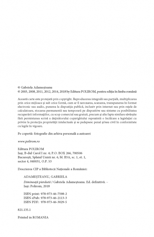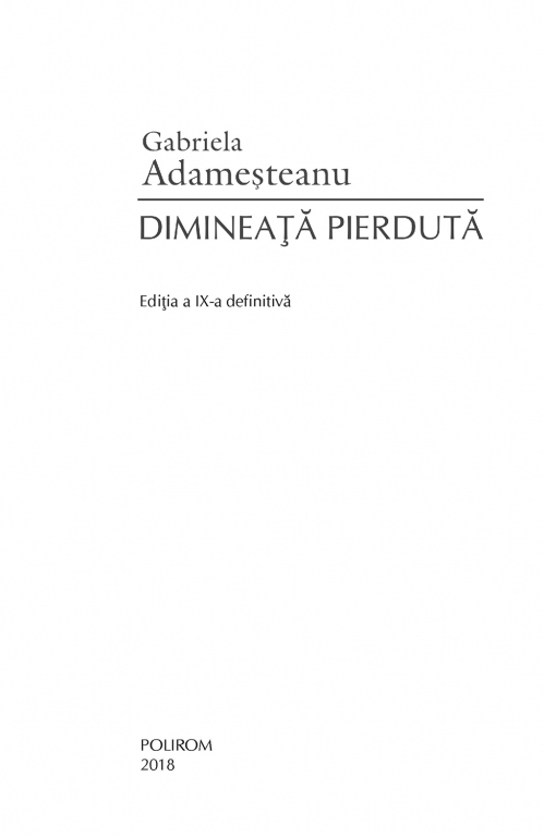 Comandă online cartea "Dimineață pierdută (ediţia a IX-a)" la 42,20 lei isbn 9789734675982 scrisă de Gabriela Adamesteanu, tiparită la editura Polirom face parte din colecția Seria de autor Gabriela Adamesteanu. cu plata ramburs sau online cu cardul. Momentan titlul "Dimineață pierdută (ediţia a IX-a)" nu este disponibil însa vă puteți înscrie pentru a fi notificat în momenul reaprovizionarii.