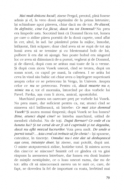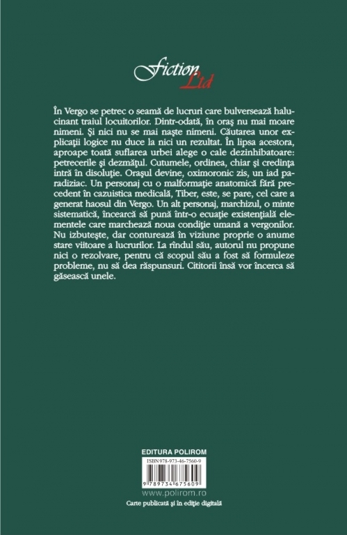 În Vergo se petrec o seamă de lucruri care bulversează halucinant traiul locuitorilor. Dintr-odată, în oraş nu mai moare nimeni. Şi nici nu se mai naşte nimeni. Căutarea unor explicaţii logice nu duce la nici un rezultat. În lipsa acestora, aproape toată suflarea urbei alege o cale dezinhibatoare: petrecerile şi dezmăţul. Cutumele, ordinea, chiar şi credinţa intră în disoluţie. Oraşul devine, oximoronic zis, un iad paradiziac. Un personaj cu o malformaţie anatomică fără precedent în cazuistica medicală, Tiber, este, se pare, cel care a generat haosul din Vergo. Un alt personaj, marchizul, o minte sistematică, încearcă să pună într-o ecuaţie existenţială elementele care marchează noua condiţie umană a vergonilor. Nu izbuteşte, dar conturează în viziune proprie o anume stare viitoare a lucrurilor. La rîndul său, autorul nu propune nici o rezolvare, pentru că scopul său a fost să formuleze probleme, nu să dea răspunsuri. Cititorii însă vor încerca să găsească unele.