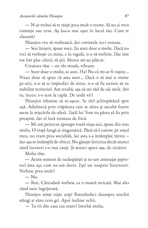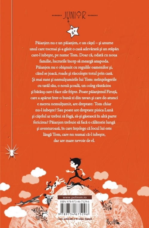 Păianjen nu e un păianjen, e un căţel – şi anume unul care tocmai şi-a găsit o casă adevărată şi un stăpîn care-l iubeşte, pe nume Tom. Doar că, odată cu noua familie, lucrurile încep să meargă anapoda. Păianjen nu e obişnuit cu regulile oamenilor şi, cînd se joacă, roade şi răscoleşte totul prin casă. Şi mai sînt şi nemulţumirile lui Tom: neînţelegerile cu tatăl său, o nouă şcoală, un coleg răutăcios şi bătăuş care-i face zile fripte. Poate păianjenul Firuţă, care a apărut într-o bună zi din tavan şi care de-atunci e mereu nemulţumit, are dreptate: Tom chiar nu-l iubeşte? Sau poate are dreptate pisica Lună şi căţelul ar trebui să fugă, să-şi găsească în altă parte fericirea? Păianjen trebuie să facă o călătorie lungă şi aventuroasă, în care înţelege că locul lui este lîngă Tom, care nu numai că-l iubeşte, dar are mare nevoie de el.