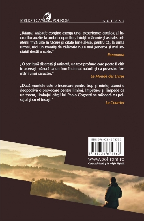 Roman autobiografic înrudit cu bestsellerul Cei opt munţi, Băiatul sălbatic are drept protagonist un bărbat în vîrstă de treizeci de ani, singuratic, dezorientat şi care şi-a pierdut încrederea în sine. Cei zece ani în care nu a mai văzut munţii unde a descoperit libertatea pe cînd era copil şi-au lăsat amprenta asupra sa, transformîndu-l într-un om vlăguit şi demoralizat. Şi acesta e motivul pentru care se hotărăşte să închirieze o cabană aflată la 1.900 de metri altitudine ca să trăiască, timp de cîteva luni, viaţa la care visase întotdeauna în secret. Izolat de lume, avînd drept companie doar nişte localnici, cîteva animale şi cărţile autorilor preferaţi – Henry David Thoreau, Jon Krakauer, Elisée Reclus –, îşi recapătă forţele, redescoperind totodată esenţa propriei fiinţe: inspiraţia de a scrie. Jurnal, meditaţie filozofică şi jurnal de călătorie deopotrivă, Băiatul sălbatic este o reflecţie profundă asupra singurătăţii, prieteniei şi relaţiei cu natura şi cu familia. O carte emoţionantă şi plină de forţă aparţinînd uneia dintre vocile de prim rang ale literaturii italiene contemporane.