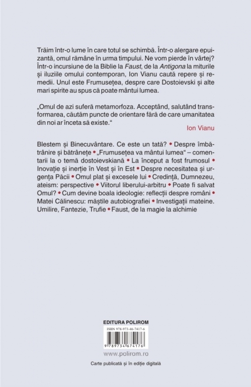 Trăim într-o lume în care totul se schimbă. Într-o alergare epuizantă, omul rămîne în urma timpului. Ne vom pierde în vîrtej? Într-o incursiune de la Biblie la Faust, de la Antigona la miturile și iluziile omului contemporan, Ion Vianu caută repere și remedii. Unul este Frumusețea, despre care Dostoievski și alte mari spirite au spus că poate mîntui lumea.