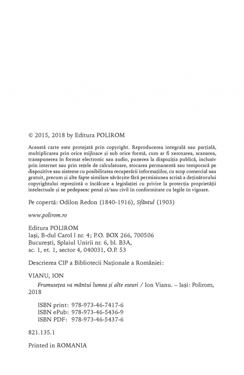 Comandă online Frumusețea va mîntui lumea și alte eseuri (ediție adăugită) la 52,80 lei isbn 9789734674176 scrisă de Ion Vianu, tiparită la editura Polirom face parte din colecția -. cu plata ramburs sau online cu cardul. Momentan titlul Frumusețea va mîntui lumea și alte eseuri (ediție adăugită) nu este disponibil însa vă puteți înscrie pentru a fi notificat în momenul reaprovizionarii.