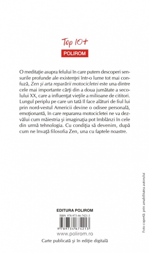 O meditaţie asupra felului în care putem descoperi sensurile profunde ale existenţei într-o lume tot mai confuză, Zen şi arta reparării motocicletei este una dintre cele mai importante cărţi din a doua jumătate a secolului XX, care a influenţat vieţile a milioane de cititori. Lungul periplu pe care un tată îl face alături de fiul lui prin nord-vestul Americii devine o odisee personală, emoţionantă, în care repararea motocicletei ne va dezvălui cum măiestria şi imaginaţia pot îmblînzi în cele din urmă tehnologia. Cu condiţia să devenim, după cum ne învaţă filosofia Zen, una cu faptele noastre.