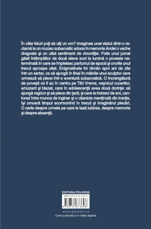 În cîte feluri poţi să uiţi un om? Imaginea unei statui dintr-o reclamă la un muzeu subacvatic aduce în memoria Andei o veche dragoste şi un uitat sentiment de vinovăţie. Foile unui jurnal găsit întîmplător de două eleve scot la lumină o poveste neterminată în care se împletesc parfumul de epocă şi ororile unui trecut aproape uitat. Enigmaticele foi rămîn apoi ani de zile într-un sertar, ca să ajungă în final în mîinile unui sculptor care urmează să plece într-o aventură subacvatică. O încrengătură de poveşti ce îl au în centru pe Tibi Vreme, veşnicul cuceritor, amuzant şi blazat, care în adolescenţă avea două dorinţe: să ajungă regizor şi să plece din ţară; şi care la treizeci de ani, cantonat între munca de inginer şi o căsnicie menţinută din inerţie, îşi omoară timpul scormonind în trecut şi imaginînd plecări.