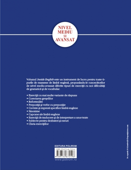 Volumul Inside English este un instrument de lucru pentru toate tipurile de examene de limbă engleză, propunîndu-le cunoscătorilor de nivel mediu-avansat diferite tipuri de exerciţii cu noi dificultăţi de gramatică şi de vocabular.