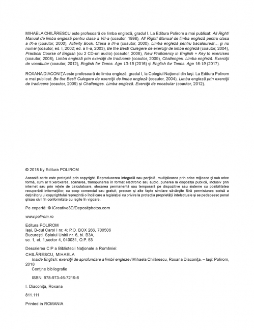 Comandă online Inside English. Exerciţii de aprofundare a limbii engleze la 36,90 lei isbn 9789734672196 scrisă de Mihaela Chilarescu , Roxana Diaconita, tiparită la editura Polirom face parte din colecția Limbi straine. Cartea poate fi livrată în circa 5 zile cu plata ramburs sau online cu cardul.