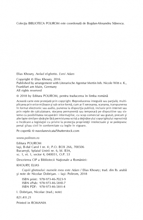 Comandă online cartea "Copiii ghetoului. Numele meu este Adam" la 11,66 lei isbn 9789734670239 scrisă de Elias Khoury, tiparită la editura Polirom face parte din colecția BIBLIOTECA POLIROM -> Actual. cu plata ramburs sau online cu cardul. Momentan titlul "Copiii ghetoului. Numele meu este Adam" nu este disponibil însa vă puteți înscrie pentru a fi notificat în momenul reaprovizionarii.