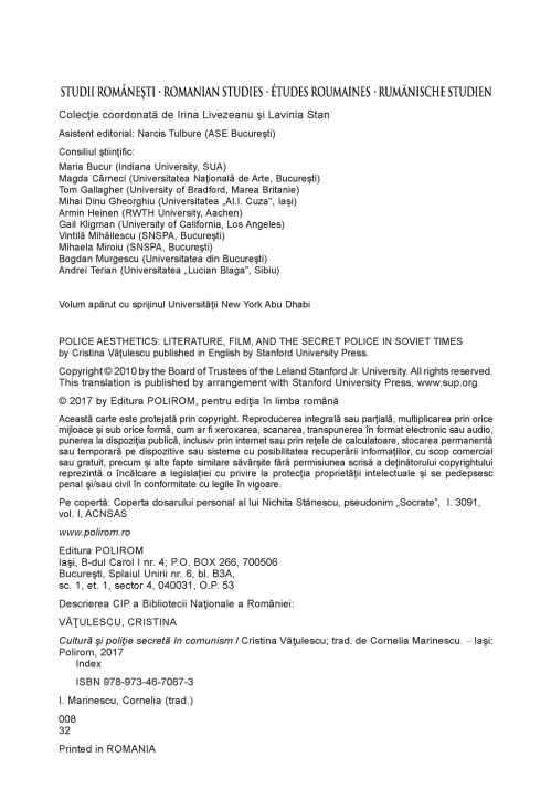 Deschiderea arhivelor poliţiilor secrete a iscat scandaluri compromiţătoare în tot fostul bloc sovietic. Cultură şi poliţie secretă în comunism este o analiză revelatoare şi responsabilă a acestor arhive, autoarea oprindu-se asupra celor mai temute documente – dosarele personale – şi asupra mai puţin cunoscutelor colecţii de filme. Cristina Văţulescu arată că dosarul personal a fost genul biografic cel mai puternic şi mai răspîndit în comunism, cu structură predefinită, şi îi studiază efectele asupra dezvoltării autobiografiei, romanului şi altor genuri literare majore în epocă. De asemenea, studiul filmelor poliţieneşti scoate la iveală influenţele reciproce dintre acestea şi dezvoltarea unor genuri cinematografice importante: documentarul, melodrama şi reconstituirea. Prin aceste analize, cartea deschide un nou capitol în controversata dezbatere asupra relaţiei dintre cultură şi politică în secolul XX.