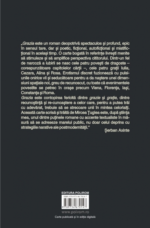 „Grazia este un roman deopotrivă spectaculos şi profund, epic în sensul tare, dar şi poetic, ficţional, autoficţional şi mistificţional în acelaşi timp. O carte bogată în referinţe livreşti menite să stimuleze şi să amplifice perspectiva cititorului. Dintr-un fel de narcoză a iubirii se nasc cele patru poveşti de dragoste – corespunzătoare capitolelor cărţii –, cele patru graţii Iulia, Cezara, Alina şi Rosa. Erotismul discret fuzionează cu pulsiunile onirice vii şi seducătoare pentru a da naştere unei dimensiuni spaţiale noi, greu de recunoscut, cu toate că evenimentele povestite se petrec în oraşe precum Viena, Florenţa, Iaşi, Constanţa şi Roma. Grazia este contopirea fericită dintre grazie şi graţie, dintre recunoştinţă şi recunoaştere a celor care, pentru a putea trăi cu adevărat, trebuie să se strecoare unii în mintea celorlalţi. Această carte scrisă şi trăită de Mircea Ţuglea este, după ştiinţa mea, unul dintre puţinele romane cu accente textualiste în măsură să se adreseze marelui public, nu doar celui deprins cu strategiile narative ale postmodernităţii.” (Şerban Axinte)