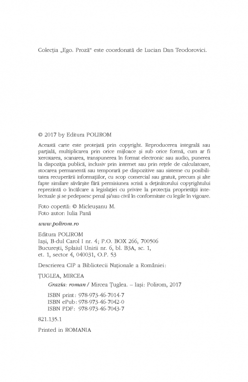 Comandă online Grazia la 10,60 lei isbn 9789734670147 scrisă de Mircea Ţuglea, tiparită la editura Polirom face parte din colecția Ego. Proza. Cartea poate fi livrată în circa 2 zile cu plata ramburs sau online cu cardul.