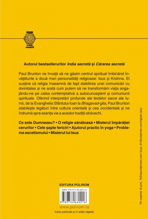 Paul Brunton ne învaţă să ne găsim centrul spiritual îmbinînd învăţăturile a două mari personalităţi religioase: Isus şi Krishna. El susţine că religia înseamnă de fapt stabilirea unei comunicări cu divinitatea şi ne arată cum putem să ne transformăm viaţa angajîndu-ne pe calea contemplativă a autocunoaşterii şi comuniunii spirituale. Oferind interpretări profunde ale textelor sacre ale lumii, de la Evanghelia Sfîntului Ioan la Bhagavad-gita, Paul Brunton stabileşte legături între cultura orientală şi cea occidentală şi ne îndrumă spre esenţa vie a acestor tradiţii străvechi.