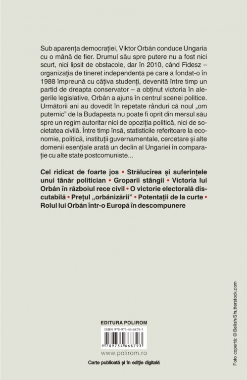 Sub aparenţa democraţiei, Viktor Orbán conduce Ungaria cu o mînă de fier. Drumul său spre putere nu a fost nici scurt, nici lipsit de obstacole, dar în 2010, cînd Fidesz – organizaţia de tineret independentă pe care a fondat-o în 1988 împreună cu cîţiva studenţi, devenită între timp un partid de dreapta conservator – a obţinut victoria în alegerile legislative, Orbán a ajuns în centrul scenei politice. Următorii ani au dovedit în repetate rînduri că noul „om puternic” de la Budapesta nu poate fi oprit din mersul său spre un regim autoritar nici de opoziţia politică, nici de societatea civilă. Între timp însă, statisticile referitoare la economie, politică, instituţii guvernamentale, cercetare şi alte domenii esenţiale arată un declin al Ungariei în comparaţie cu alte state postcomuniste...