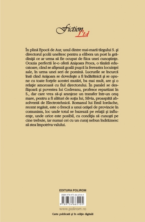 În plină Epocă de Aur, unul dintre mai-marii tîrgului S. şi directorul şcolii uneltesc pentru a elibera un post la grădiniţă ce ar urma să fie ocupat de fiica unei cunoştinţe. Ocazia perfectă le-o oferă Anişoara Proca, o tînără educatoare, cînd se afişează goală puşcă la fereastra locuinţei sale, în urma unei seri de pomină. Lucrurile se încurcă însă cînd Anişoara se dovedeşte a fi îndărătnică şi se opune cu toate forţele acestei mutări, ba mai mult, are şi o relaţie amoroasă cu fiul directorului. În paralel se desfăşoară şi povestea lui Codreanu, profesor repartizat în S., dar care vrea să-şi aranjeze un transfer într-un oraş mare, pentru a fi alături de soţia lui, Silvia, proaspătă absolventă de Electrotehnică. Romanul lui Emil Iordache, recent regăsit, este o frescă a unui orăşel de provincie în comunism, loc unde totul se bazează pe relaţii şi influenţe, unde orice este posibil, cu condiţia să cunoşti pe cine trebuie, iar numai cei cu un curaj nebun îndrăznesc să stea împotriva valului.