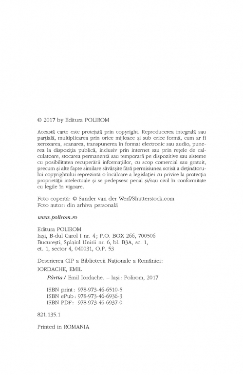 Comandă online cartea "Pârtia" la 10,60 lei isbn 9789734665105 scrisă de Emil Iordache, tiparită la editura Polirom face parte din colecția Fiction Ltd. Cartea poate fi livrată în circa 2 zile cu plata ramburs sau online cu cardul.