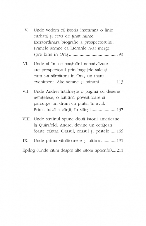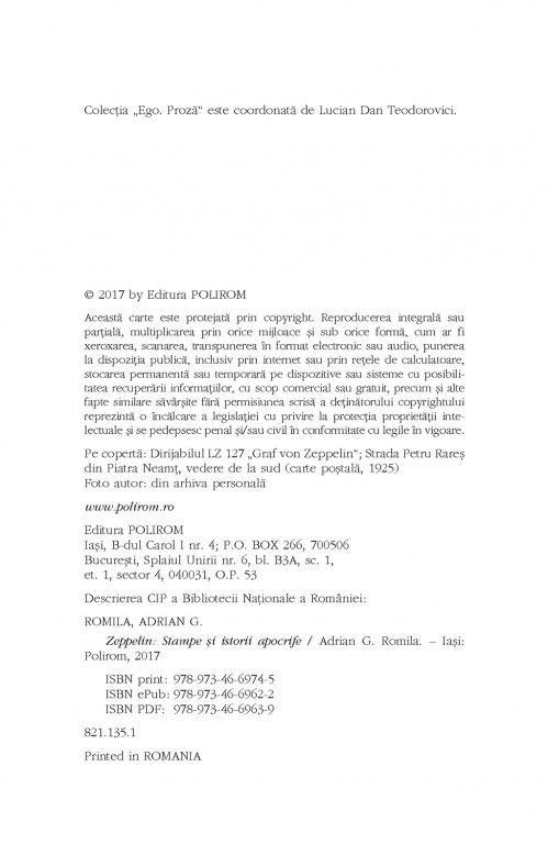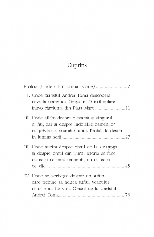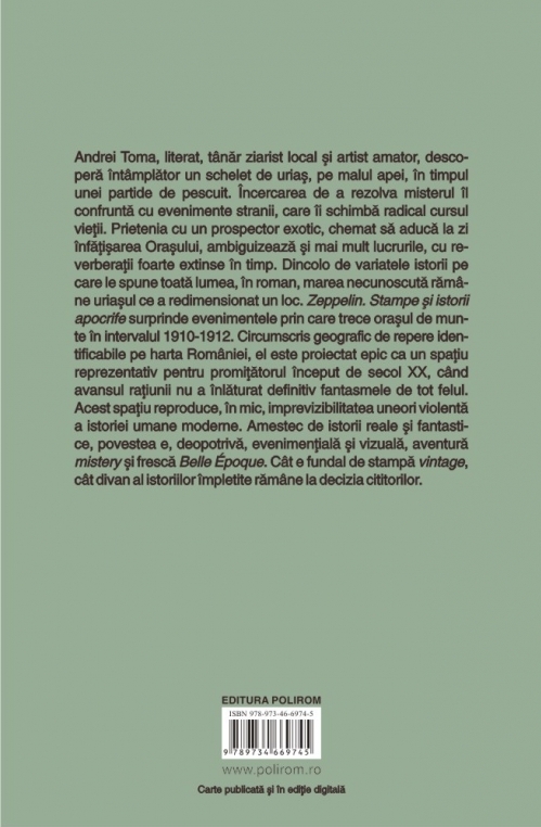 Andrei Toma, literat, tînăr ziarist local şi artist amator, descoperă întîmplător un schelet de uriaş, pe malul apei, în timpul unei partide de pescuit. Încercarea de a rezolva misterul îl confruntă cu evenimente stranii, care îi schimbă radical cursul vieţii. Prietenia cu un prospector exotic, chemat să aducă la zi înfăţişarea Oraşului, ambiguizează şi mai mult lucrurile, cu reverberaţii foarte extinse în timp. Dincolo de variatele istorii pe care le spune toată lumea, în roman, marea necunoscută rămîne uriaşul ce a redimensionat un loc. Zeppelin. Stampe şi istorii apocrife surprinde evenimentele prin care trece oraşul de munte în intervalul 1910-1912. Circumscris geografic de repere identificabile pe harta României, el este proiectat epic ca un spaţiu reprezentativ pentru promiţătorul început de secol XX, cînd avansul raţiunii nu a înlăturat definitiv fantasmele de tot felul. Acest spaţiu reproduce, în mic, imprevizibilitatea uneori violentă a istoriei umane moderne. Amestec de istorii reale şi fantastice, povestea e, deopotrivă, evenimenţială şi vizuală, aventură mistery şi frescă Belle Époque. Cît e fundal de stampă vintage, cît divan al istoriilor împletite rămîne la decizia cititorilor.