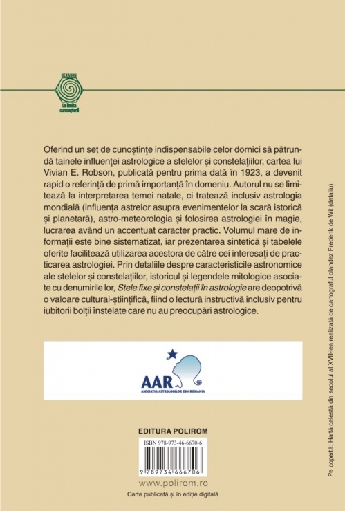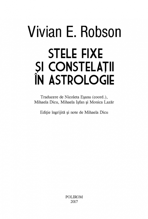 Oferind un set de cunoştinţe indispensabile celor dornici să pătrundă tainele influenţei astrologice a stelelor şi constelaţiilor, cartea lui Vivian E. Robson, publicată pentru prima dată în 1923, a devenit rapid o referinţă de primă importanţă în domeniu. Autorul nu se limitează la interpretarea temei natale, ci tratează inclusiv astrologia mondială (influenţa astrelor asupra evenimentelor la scară istorică şi planetară), astro-meteorologia şi folosirea astrologiei în magie, lucrarea avînd un accentuat caracter practic. Volumul mare de informaţii este bine sistematizat, iar prezentarea sintetică şi tabelele oferite facilitează utilizarea acestora de către cei interesaţi de practicarea astrologiei. Prin detaliile despre caracteristicile astronomice ale stelelor şi constelaţiilor, istoricul şi legendele mitologice asociate cu denumirile lor, Stele fixe şi constelaţii în astrologie are deopotrivă o valoare cultural-ştiinţifică, fiind o lectură instructivă inclusiv pentru iubitorii bolţii înstelate care nu au preocupări astrologice.