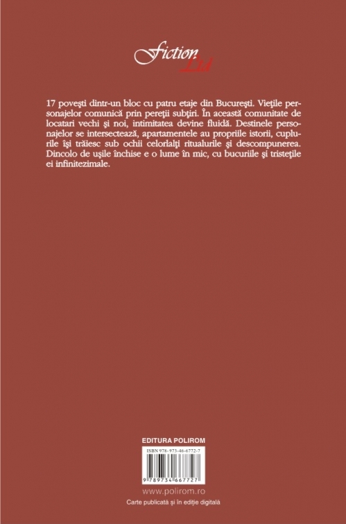 17 poveşti dintr-un bloc cu patru etaje din Bucureşti. Vieţile personajelor comunică prin pereţii subţiri. În această comunitate de locatari vechi şi noi, intimitatea devine fluidă. Destinele personajelor se intersectează, apartamentele au propriile istorii, cuplurile îşi trăiesc sub ochii celorlalţi ritualurile şi descompunerea. Dincolo de uşile închise e o lume în mic, cu bucuriile şi tristeţile ei infinitezimale.