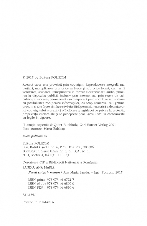 Comandă online Pereţi subţiri la 31,70 lei isbn 9789734667727 scrisă de Ana Maria Sandu, tiparită la editura Polirom face parte din colecția Fiction Ltd. Cartea poate fi livrată în circa 5 zile cu plata ramburs sau online cu cardul.