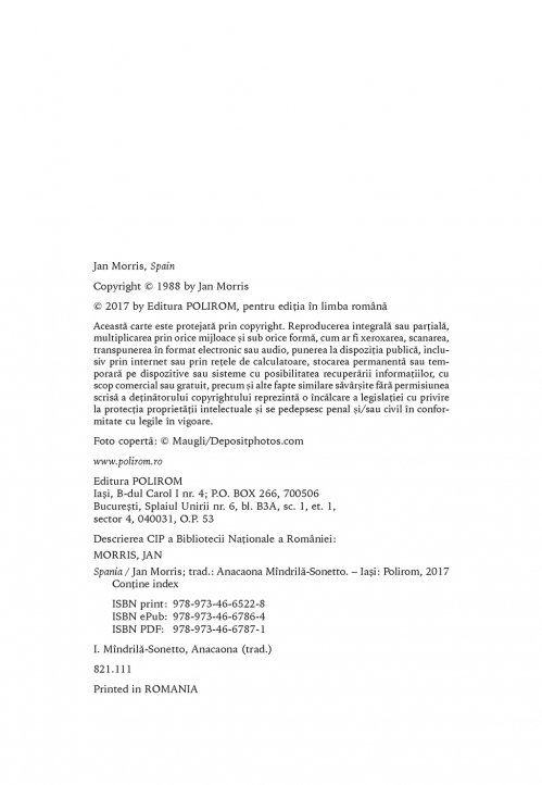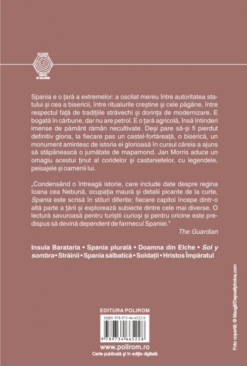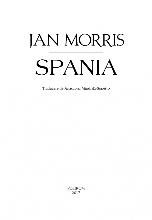 Spania e o ţară a extremelor: a oscilat mereu între autoritatea statului şi cea a bisericii, între ritualurile creştine şi cele păgîne, între respectul faţă de tradiţiile străvechi şi dorinţa de modernizare. E bogată în cărbune, dar nu are petrol. E o ţară agricolă, însă întinderi imense de pămînt rămîn necultivate. Deşi pare să-şi fi pierdut definitiv gloria, la fiecare pas un castel-fortăreaţă, o biserică, un monument amintesc de istoria ei glorioasă în cursul căreia a ajuns să stăpînească o jumătate de mapamond. Jan Morris aduce un omagiu acestui ţinut al coridelor şi castanietelor, cu legendele, peisajele şi oamenii lui.