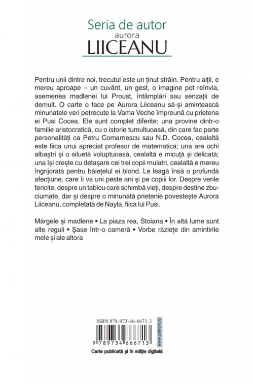 Pentru unii dintre noi, trecutul este un ţinut străin. Pentru alţii, e mereu aproape – un cuvînt, un gest, o imagine pot reînvia, asemenea madlenei lui Proust, întîmplări sau senzaţii de demult. O carte o face pe Aurora Liiceanu să-şi amintească minunatele veri petrecute la Vama Veche împreună cu prietena ei Pusi Cocea. Ele sînt complet diferite: una provine dintr-o familie aristocratică, cu o istorie tumultuoasă, din care fac parte personalităţi ca Petru Comarnescu sau N.D. Cocea, cealaltă este fiica unui apreciat profesor de matematică; una are ochi albaştri şi o siluetă voluptuoasă, cealaltă e micuţă şi delicată; una îşi creşte cu detaşare cei trei copii mulatri, cealaltă e mereu îngrijorată pentru băieţelul ei blond. Le leagă însă o profundă afecţiune, care îi va uni peste ani şi pe copiii lor. Despre verile fericite, despre un tablou care schimbă vieţi, despre destine zbuciumate, dar şi despre o minunată prietenie povesteşte Aurora Liiceanu, completată de Nayla, fiica lui Pusi.