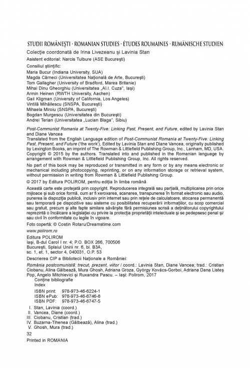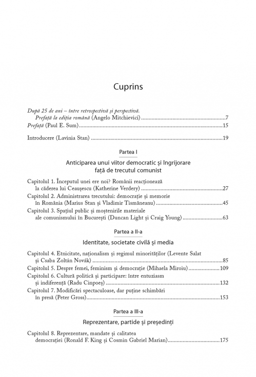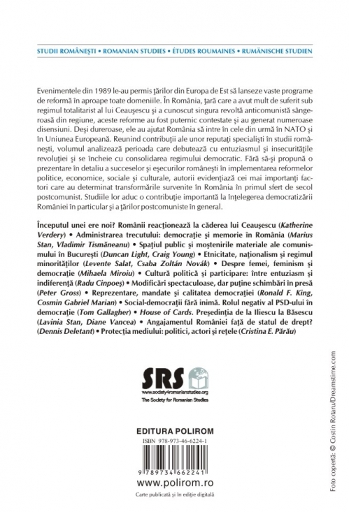 Evenimentele din 1989 le-au permis ţărilor din Europa de Est să lanseze vaste programe de reformă în aproape toate domeniile. În România, ţară care a avut mult de suferit sub regimul totalitarist al lui Ceauşescu şi a cunoscut singura revoltă anticomunistă sîngeroasă din regiune, aceste reforme au fost puternic contestate şi au generat numeroase disensiuni. Deşi dureroase, ele au ajutat România să intre în cele din urmă în NATO şi în Uniunea Europeană. Reunind contribuţii ale unor reputaţi specialişti în studii româneşti, volumul analizează perioada care debutează cu entuziasmul şi insecurităţile revoluţiei şi se încheie cu consolidarea regimului democratic. Fără să-şi propună o prezentare în detaliu a succeselor şi eşecurilor româneşti în implementarea reformelor politice, economice, sociale şi culturale, autorii evidenţiază cei mai importanţi factori care au determinat transformările survenite în România în primul sfert de secol postcomunist. Studiile lor aduc o contribuţie importantă la înţelegerea democratizării României în particular şi a ţărilor postcomuniste în general.