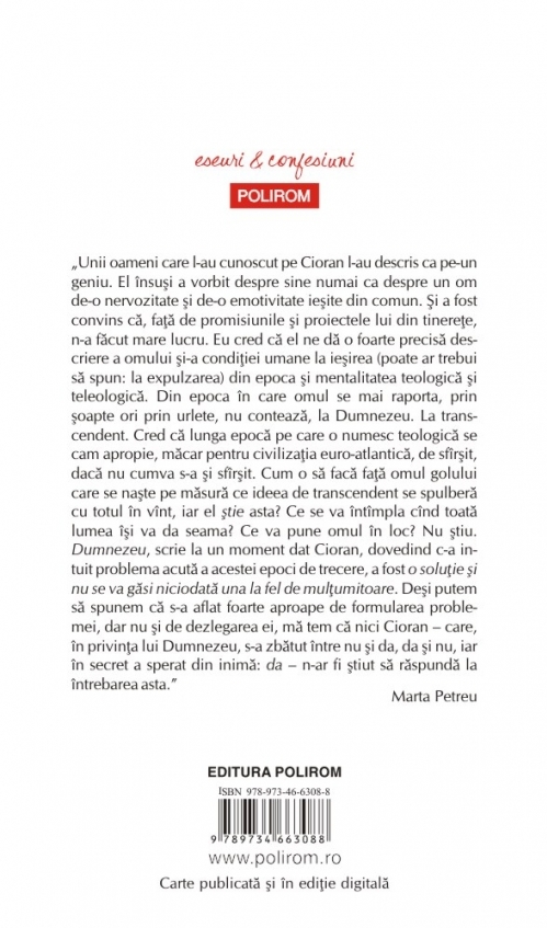 „Unii oameni care l-au cunoscut pe Cioran l-au descris ca pe-un geniu. El însuşi a vorbit despre sine numai ca despre un om de-o nervozitate şi de-o emotivitate ieşite din comun. Şi a fost convins că, faţă de promisiunile şi proiectele lui din tinereţe, n-a făcut mare lucru. Eu cred că el ne dă o foarte precisă descriere a omului şi-a condiţiei umane la ieşirea (poate ar trebui să spun: la expulzarea) din epoca şi mentalitatea teologică şi teleologică. Din epoca în care omul se mai raporta, prin şoapte ori prin urlete, nu contează, la Dumnezeu. La transcendent. Cred că lunga epocă pe care o numesc teologică se cam apropie, măcar pentru civilizaţia euro-atlantică, de sfîrşit, dacă nu cumva s-a şi sfîrşit. Cum o să facă faţă omul golului care se naşte pe măsură ce ideea de transcendent se spulberă cu totul în vînt, iar el ştie asta? Ce se va întîmpla cînd toată lumea îşi va da seama? Ce va pune omul în loc? Nu ştiu. Dumnezeu, scrie la un moment dat Cioran, dovedind c-a intuit problema acută a acestei epoci de trecere, a fost o soluţie şi nu se va găsi niciodată una la fel de mulţumitoare. Deşi putem să spunem că s-a aflat foarte aproape de formularea problemei, dar nu şi de dezlegarea ei, mă tem că nici Cioran – care, în privinţa lui Dumnezeu, s-a zbătut între nu şi da, da şi nu, iar în secret a sperat din inimă: da – n-ar fi ştiut să răspundă la întrebarea asta.” (Marta Petreu)