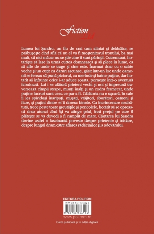 Lumea lui Şandru, un fiu de crai cam alintat şi delăsător, se prăbuşeşte cînd află că nu el va fi moştenitorul tronului, ba mai mult, că nici măcar nu se ştie cine îi sînt părinţii. Cutremurat, hotărăşte să lase în urmă curtea domnească şi să plece în lume, ca să afle de unde se trage şi cine este. Înarmat doar cu o sabie veche şi un cuţit cu daruri ascunse, găsit într-un loc unde oamenii se fereau să pună piciorul, cu merinde şi haine puţine, dar hotărît să înfrunte orice i-ar aduce soarta, porneşte într-o aventură fabuloasă. Lui i se alătură prieteni vechi şi noi şi împreună traversează cîmpii sterpe, munţi înalţi şi un codru fermecat, unde puţine lucruri sînt ceea ce par a fi. Călătoria nu e uşoară, în cale îi ies spiriduşi înaripaţi, muşaţi, vrăjitori, sburători, oameni şi fiare, şi puţini dintre ei îi doresc binele. Cu încrîncenare neabătută, trece peste toate greutăţile şi pericolele, hotărît să se oprească doar atunci cînd îşi va atinge ţelul, însă preţul pe care îl plăteşte se va dovedi a fi cumplit de mare. Căutarea lui Şandru devine astfel o fascinantă poveste despre prietenie şi trădare, despre lungul drum către aflarea rădăcinilor şi a adevărului.
