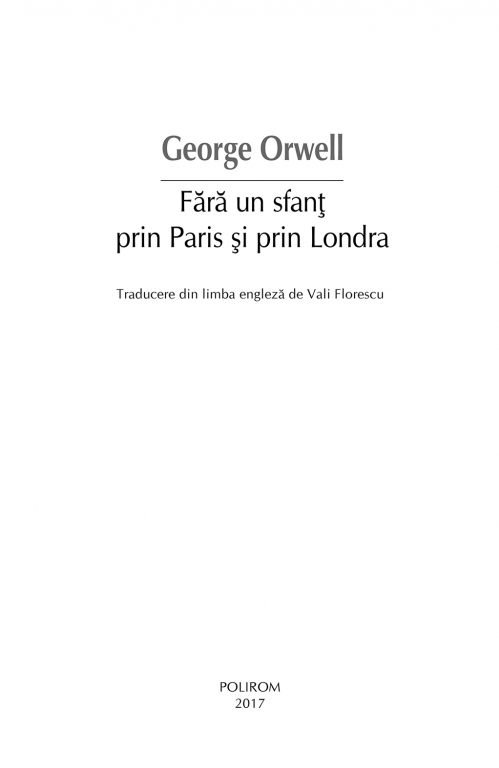 Prima carte a lui George Orwell, Fără un sfanţ prin Paris şi prin Londra este o relatare emoţionantă şi foarte detaliată a celor cîţiva ani de sărăcie autoimpusă prin care a trecut scriitorul după ce s-a întors din Birmania. Aflat în căutarea propriei voci narative, Orwell repudiază societatea „respectabilă” şi explorează viaţa defavorizaţilor sorţii, trăind în cămăruţe mizere şi spălînd vase în bucătăria încinsă ca un cuptor a vreunui hotel parizian sau învîrtindu-se printre cerşetorii excentrici ai Londrei, al căror limbaj pestriţ îl înregistrează fidel. Figurile surprinzătoare de cocote, drogaţi, cerşetori care folosesc ziare pe post de lenjerie şi cerşetori schilozi cu talente filozofice pe care le aduce în scenă Orwell dezvăluie chipul hîd al sărăciei, care pune sub semnul îndoielii orice urmă de umanitate. Fără un sfanţ prin Paris şi prin Londra urmează să fie adaptată pentru marele ecran, după un scenariu de Lee Hall, de către regizorul scoţian Kevin Macdonald.