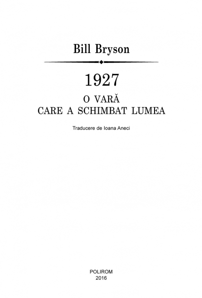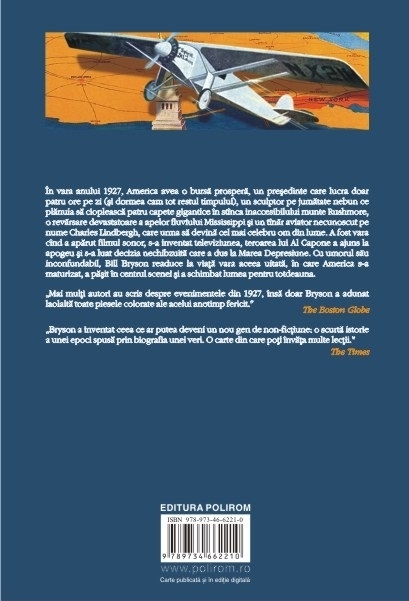 În vara anului 1927, America avea o bursă prosperă, un preşedinte care lucra doar patru ore pe zi (şi dormea cam tot restul timpului), un sculptor pe jumătate nebun ce plănuia să cioplească patru capete gigantice în stînca inaccesibilului munte Rushmore, o revărsare devastatoare a apelor fluviului Mississippi şi un tînăr aviator necunoscut pe nume Charles Lindbergh, care urma să devină cel mai celebru om din lume. A fost vara cînd a apărut filmul sonor, s-a inventat televiziunea, teroarea lui Al Capone a ajuns la apogeu şi s-a luat decizia nechibzuită care a dus la Marea Depresiune. Cu umorul său inconfundabil, Bill Bryson readuce la viaţă vara aceea uitată, în care America s-a maturizat, a păşit în centrul scenei şi a schimbat lumea pentru totdeauna.