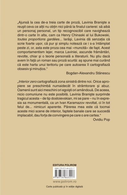 Interior zero cartografiază zona sinistră dintre noi. Orice apropiere se preschimbă numaidecît în strîmtorare şi abuz. Oamenii sînt aici meschini ori egoişti ori amîndouă. De aceea, nicio comuniune nu este posibilă. Lavinia Branişte surprinde tragicul acesta – de tip dostoievskian, mi se pare – nu în expresia sa monumentală, ca un Ivan Karamazov revoltat, ci în tot felul de... nimicuri aparente. Părerea mea este că tocmai aceste mici scene de interior, faptele banale care se succedă implacabil, dau forţa de convingere pe care o are cartea.” (Ovidiu Pop)