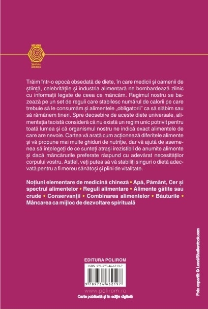 Trăim într-o epocă obsedată de diete, în care medicii şi oamenii de ştiinţă, celebrităţile şi industria alimentară ne bombardează zilnic cu informaţii legate de ceea ce mîncăm. Regimul nostru se bazează pe un set de reguli care stabilesc numărul de calorii pe care trebuie să le consumăm şi alimentele „obligatorii” ca să slăbim sau să rămînem tineri. Spre deosebire de aceste diete universale, alimentaţia taoistă consideră că nu există un regim unic potrivit pentru toată lumea şi că organismul nostru ne indică exact alimentele de care are nevoie. Cartea vă arată cum acţionează diferitele alimente şi vă propune mai multe ghiduri de nutriţie, dar vă ajută de asemenea să înţelegeţi de ce sînteţi atraşi irezistibil de anumite alimente şi dacă mîncărurile preferate răspund cu adevărat necesităţilor corpului vostru. Astfel, veţi putea să vă stabiliţi singuri o dietă adecvată pentru a fi mereu sănătoşi şi plini de vitalitate.