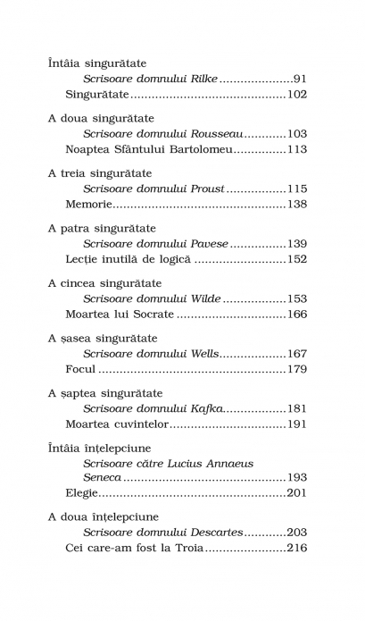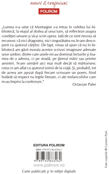 „Lumea n-a uitat că Montaigne s-a retras în celebra lui bibliotecă, la etajul al doilea al unui turn, să reflecteze asupra condiţiei umane şi să-şi scrie opera. Iată de ce simt nevoia să recunosc că nici dragostea, nici singurătatea nu le-am descoperit cu ajutorul cărţilor. De fapt, vreau să spun că nu în bibliotecă am găsit morala acestor scrisori imaginare adresate unor umbre, dintre care unele mi-au dominat lecturile şi foamea de a admira, ci pe stradă, pe ţărmul mării sau printre amintiri. N-am urmărit aici mai mult decît să mărturisesc ceea ce am aflat cu ajutorul inimii de la viaţă. Şi, probabil, tot de aceea am aşezat după fiecare scrisoare un poem, fiind hotărît să respect nu legile literare, ci ale melancoliilor care m-au împins la confesiuni.” (Octavian Paler)