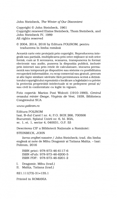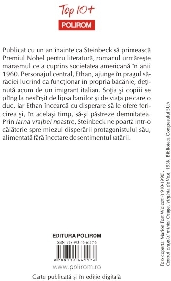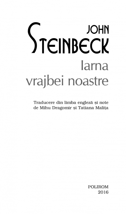Traducere din limba engleza si note de Mihu Dragomir si Tatiana Malita Premiul Nobel pentru Literatura 1962 Publicat cu un an inainte ca Steinbeck sa primeasca Premiul Nobel pentru literatura, romanul urmareste marasmul ce a cuprins societatea americana in anii 1960. Personajul central, Ethan, ajunge in pragul saraciei lucrind ca functionar in propria bacanie, detinuta acum de un imigrant italian. Sotia si copiii se pling la nesfirsit de lipsa banilor si de viata pe care o duc, iar Ethan incearca cu disperare sa le ofere fericirea si, in acelasi timp, sa-si pastreze demnitatea. Prin Iarna vrajbei noastre, Steinbeck ne poarta intr-o calatorie spre miezul disperarii protagonistului sau, alimentata fara incetare de sentimentul ratarii.