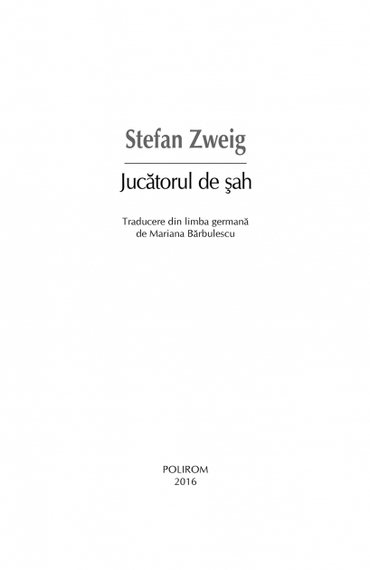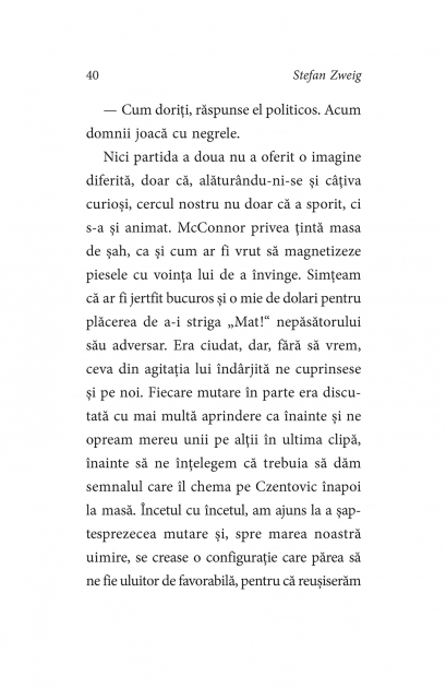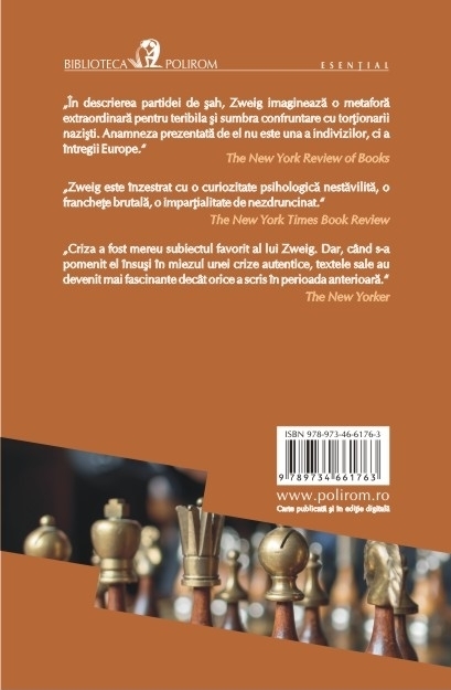 Traducere din limba germana de Mariana Barbulescu „In descrierea partidei de sah, Zweig imagineaza o metafora extraordinara pentru teribila si sumbra confruntare cu tortionarii nazisti. Anamneza prezentata de el nu este una a indivizilor, ci a intregii Europe.” (The New York Review of Books) In anii de inceput ai celui de-al Doilea Razboi Mondial, la bordul unui pachebot ce se indreapta spre Buenos Aires, calatorii descopera ca printre ei se afla un campion mondial la sah pe nume Czentovic. Talentul de sahist al jucatorului, fiu al unui luntras sarac dintr-un satuc slav, e dublat de o lipsa de educatie apropiata de grosolanie. Printr-un concurs de imprejurari, Czentovic ajunge sa se infrunte pe tabla de sah cu un grup de calatori de pe vas, pe care ii invinge cu usurinta. Atunci insa intra in scena, cu totul surprinzator, un personaj straniu, al carui trecut recent este legat de jocul de sah intr-un mod tulburator si sumbru, ce implica o confruntare cu anchetatorii gestapovisti ai Reichului nazist. Ideea de „joc al mintii” capata astfel o semnificatie mult mai ampla, iar infruntarea ce se prefigureaza pe pachebot e doar ecoul alteia, mult mai teribila. „Zweig este inzestrat cu o curiozitate psihologica nestavilita, o franchete brutala, o impartialitate de nezdruncinat.” (The New York Times Book Review) „Criza a fost mereu subiectul favorit al lui Zweig. Dar, cind s-a pomenit el insusi in miezul unei crize autentice, textele sale au devenit mai fascinante decat orice a scris in perioada anterioara.” (The New Yorker)