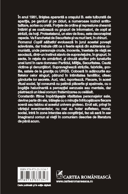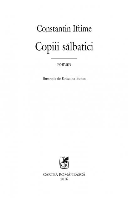 Ilustratie de Krisztina Bokos In anul 1981, linistea aparenta a orasului B. este tulburata de aparitia, pe garduri si pe ziduri, a numeroase lozinci antitotalitare, scrise cu creta. Fortele de ordine si represiune cheama intariri si se coalizeaza cu grupuri de informatori, de copii ai strazii, de hoti. Protestatarul, un elev de liceu, este deconspirat repede. Va fi anchetat de Securitate si va muri lent, in chinuri. Romanul Copiii salbatici evolueaza in jurul acestei povesti adevarate, dar trebuie citit ca o feerie epica din subterana comunista, unde personaje crude, inocente, insetate de viata se asociaza, dintr-un instinct atavic de supravietuire, in grupuri, in secte, in retele de urmaritori, si circula aiuritor prin tunelurile unei lumi in care domnesc Partidul, Militia, Securitatea. Cauta victime si denuntatori. Supravegheaza strazile, fabricile, scolile, satele de la granita cu URSS. Coboara in adincurile sufletelor celor singuri, patrund in intimitatea familiilor, citesc gindurile lor secrete. Aud, vad, raporteaza. Fiecare, in acest ritual social, isi consuma cu patima placerile si spaimele, cu o bogatie halucinanta a perceptiei senzuale sau mentale, dar pastreaza un ideal comun: fraternizarea cu celalalt. Constantin Iftime impartaseste vitalitatea personajelor sale, devine parte din ele, traieste cu o minutie infricosatoare fiecare scena sau tablou al acestui univers grotesc. Eroii sai, prinsi in virtejul evenimentelor, nu mai au hotar sufletesc, moral, social, intra in zone interzise ale constiintei, fac sa sara in aer imaginarul comun al vietii in comunism descrise de literatura de pina acum.