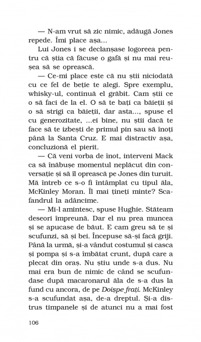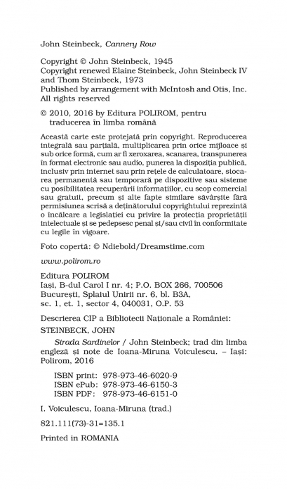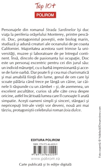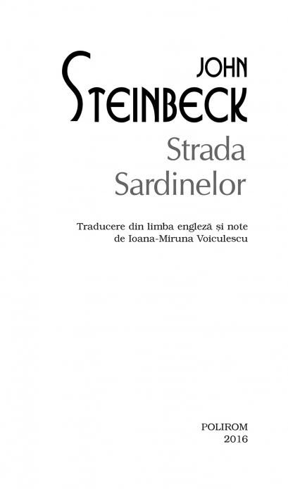 Traducere din limba engleza si note de Ioana-Miruna Voiculescu John Steinbeck a primit Premiul Nobel pentru Literatura in anul 1962. Romanul Strada Sardinelor a fost ecranizat in regia lui David S. Ward, cu Nick Nolte in rolul principal. Personajele din romanul Strada Sardinelor isi duc viata la periferia oraselului Monterey, printre pescarii. Doc, protagonistul povestii, este biolog marin, studiaza si aduna creaturi ale oceanului de pe coasta Californiei. Majoritatea acestora sint trimise la universitati, muzee si laboratoare de pe intregul continent. Insa, dincolo de pasionanta lui ocupatie, Doc este un personaj excentric pentru cei din jurul sau: un individ maruntel, cu o barba impresionanta si accese de furie oarba. Dar poate fi si cea mai charismatica si mai amabila fiinta din lume, genul de om care isi scoate palaria cind trece pe linga un ciine, iar ciinele ii raspunde cu un zimbet – si, de asemenea, un excelent ascultator, curios sa afle cite ceva despre oricine, astfel incit toata lumea care il cunoaste ii arata simpatie. Acesti oameni simpli si sinceri, stingaci si nepriceputi intr-ale vietii vor deveni, noua ani mai tirziu, protagonistii celebrului roman Joia dulce.