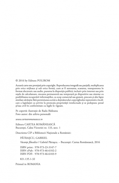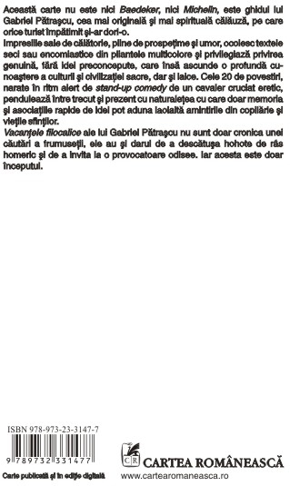 Cistigatorul Concursului de Debut – editia 2015 Aceasta carte nu este nici Baedeker, nici Michelin, este ghidul lui Gabriel Patrascu, cea mai originala si mai spirituala calauza, pe care orice turist impatimit si-ar dori-o. Impresiile sale de calatorie, pline de prospetime si umor, ocolesc textele seci sau encomiastice din pliantele multicolore si privilegiaza privirea genuina, fara idei preconcepute, care insa ascunde o profunda cunoastere a culturii si civilizatiei sacre, dar si laice. Cele 20 de povestiri, narate in ritm alert de stand-up comedy de un cavaler cruciat eretic, penduleaza intre trecut si prezent cu naturaletea cu care doar memoria si asociatiile rapide de idei pot aduna laolalta amintirile din copilarie si vietile sfintilor. Vacantele filocalice ale lui Gabriel Patrascu nu sint doar cronica unei cautari a frumusetii, ele au si darul de a descatusa hohote de ris homeric si de a invita la o provocatoare odisee. Iar acesta este doar inceputul. „Datorez aceasta carte lui Vlad Musatescu, de la care am invatat ca adevarata calatorie nu este nici cu avionul, nici cu trenul, nici cu bicicleta si nici chiar cu o copaie in loc de pluta, ci sub obladuirea unui document Word, pentru ca stii intotdeauna de unde pleci, adica de la o pagina goala, dar nu stii niciodata unde vei ajunge, in mijlocul unei jungle din care nu s-a intors nimeni sau pe o plaja aglomerata, inconjurat de priviri iritate. Cuvintele sint asemenea banilor. Unul il cheama pe celalalt si, in scurt timp, te trezesti purtat de un suvoi zornaitor pe carari fascinante, cu un zimbet timp pictat pe figura. Apoi criza mondiala te lasa sarac lipit, la marginea desertului, calare pe o jumatate de iepure schiop. Iar asta e cazul fericit. Pe mine unul scrisul acestei carti m-a vindecat de multe boli, dintre care amintesc doar ipohondria, profilaxia si fandaxia. Sper sa le fie de folos si altora. E trist sa vezi oameni tineri rapusi in floarea virstei de asemenea cumplite maladii.” (Gabriel Patrascu)