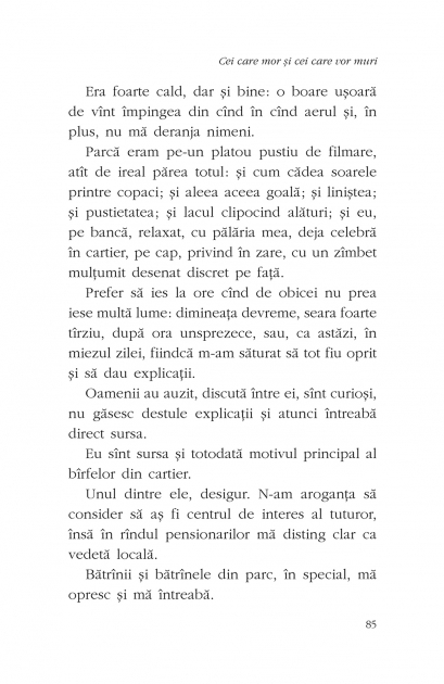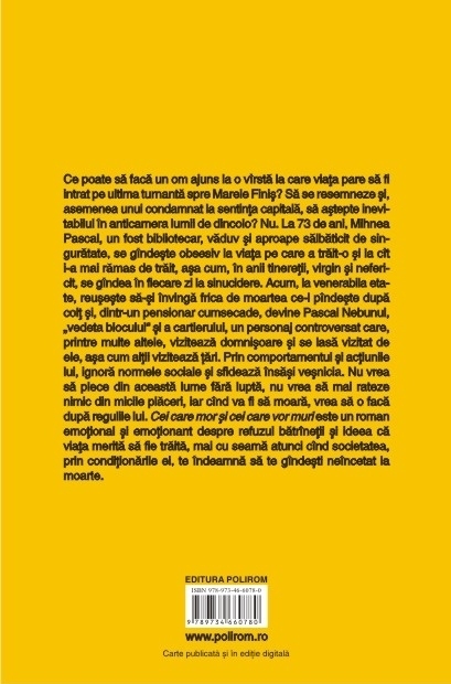 Ce poate sa faca un om ajuns la o virsta la care viata pare sa fi intrat pe ultima turnanta spre Marele Finis? Sa se resemneze si, asemenea unui condamnat la sentinta capitala, sa astepte inevitabilul in anticamera lumii de dincolo? Nu. La 73 de ani, Mihnea Pascal, un fost bibliotecar, vaduv si aproape salbaticit de singuratate, se gindeste obsesiv la viata pe care a trait-o si la cit i-a mai ramas de trait, asa cum, in anii tineretii, virgin si nefericit, se gindea in fiecare zi la sinucidere. Acum, la venerabila etate, reuseste sa-si invinga frica de moartea ce-l pindeste dupa colt si, dintr-un pensionar cumsecade, devine Pascal Nebunul, „vedeta blocului” si a cartierului, un personaj controversat care, printre multe altele, viziteaza domnisoare si se lasa vizitat de ele, asa cum altii viziteaza tari. Prin comportamentul si actiunile lui, ignora normele sociale si sfideaza insasi vesnicia. Nu vrea sa plece din aceasta lume fara lupta, nu vrea sa mai rateze nimic din micile placeri, iar cind va fi sa moara, vrea sa o faca dupa regulile lui. Cei care mor si cei care vor muri este un roman emotional si emotionant despre refuzul batrinetii si ideea ca viata merita sa fie traita, mai cu seama atunci cind societatea, prin conditionarile ei, te indeamna sa te gindesti neincetat la moarte.